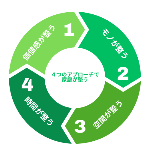 家族の不満やストレスは「性格の不一致」ではなく、「仕組みの欠如」。 家事研究所は、家庭を“ひとつのチーム”ととらえ、 価値観・モノ・空間・時間の4つのアプローチで整えることで、家庭円満を再現します。