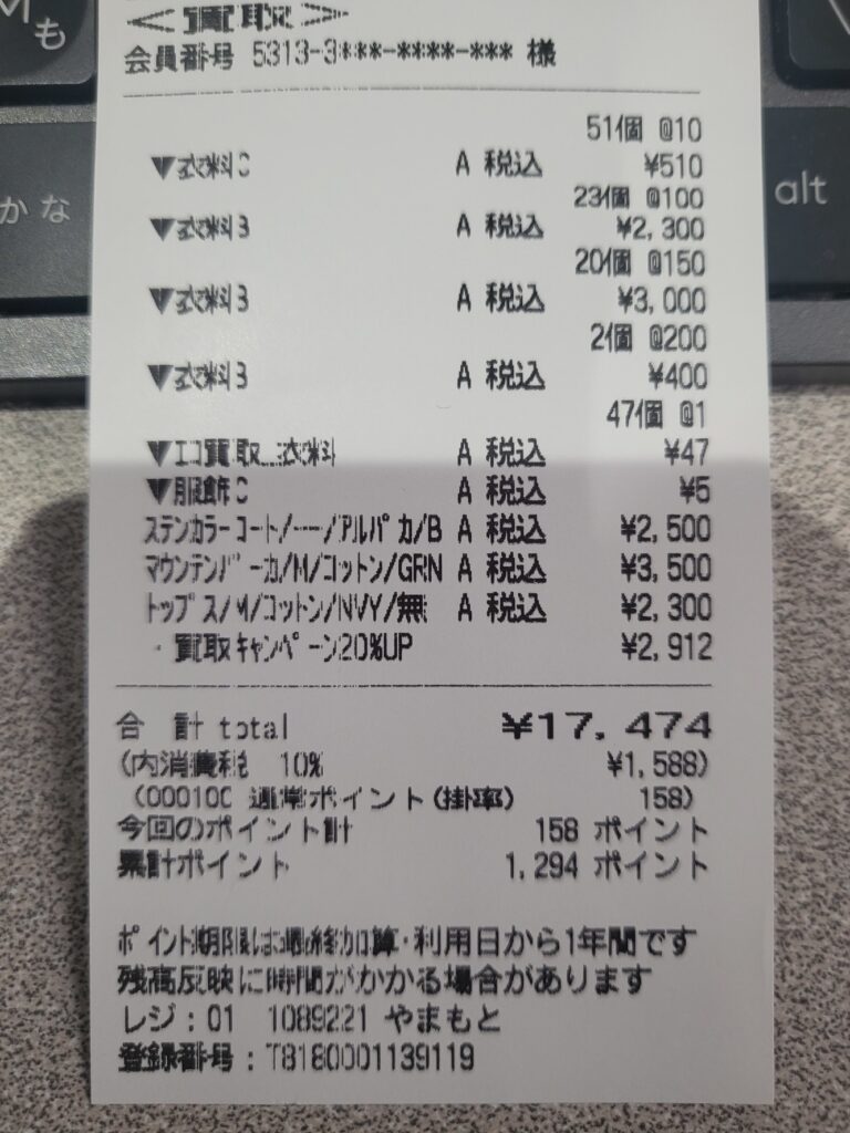 レシートによるとなんと合計147点のお洋服が定年退職して第2の人生を歩みだしたようです(笑)