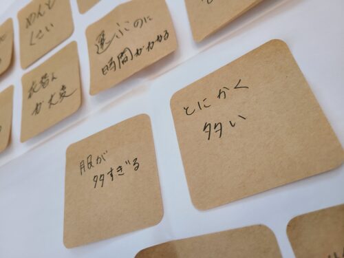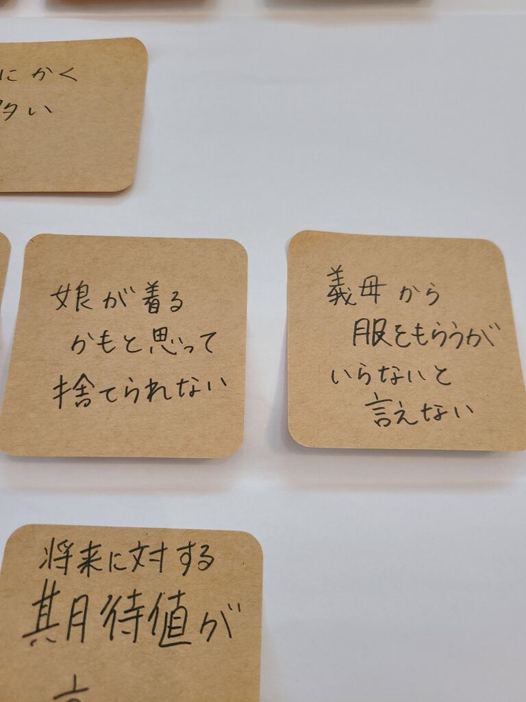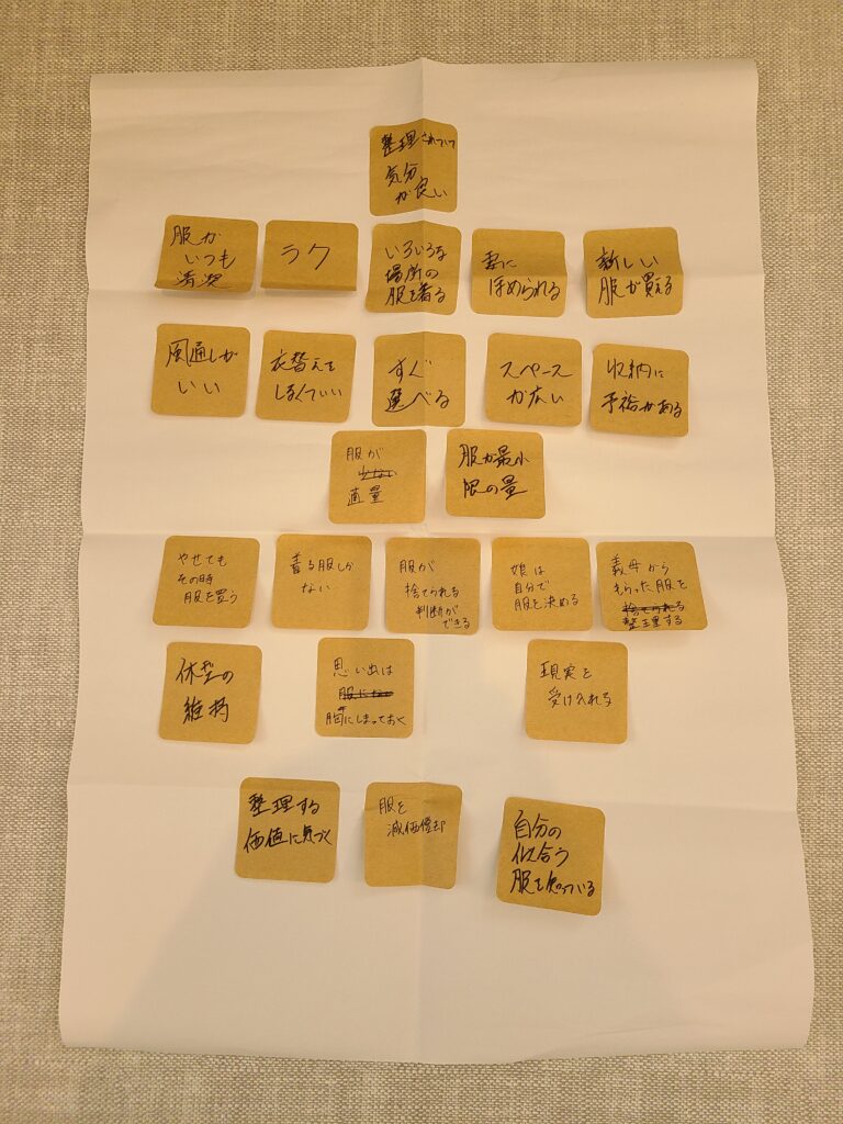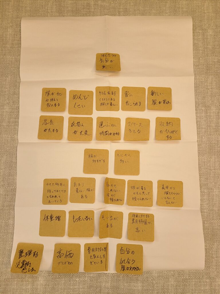 まず目に飛び込んできたのは、「服が多すぎる」と「とにかく多い」という付箋でした。ご夫婦の考え方の共通点も違いも視える化できました。