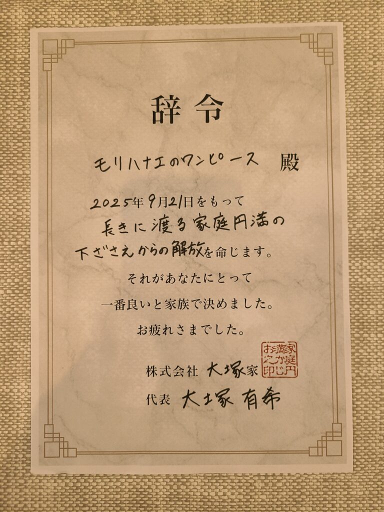 特に印象的なモノや、決心を必要としたものには、感謝の気持ちを伝えるために辞令書を作成します。
