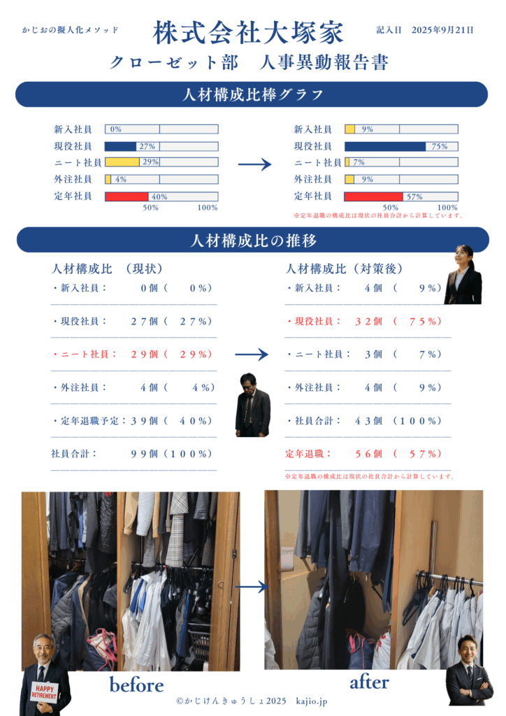 特に心に残ったのは、服を「現役社員」「退職社員」「ニート社員」などに分けることで、それぞれの服にまるで顔が見えてくるような感覚があったことです。そして、「ニート社員」が、ここにいて活躍する場もなく、ただただかわいそうである、何のために出社しているのだろう、という点に思いを馳せることができ、整理への意識が大きく変わりました。